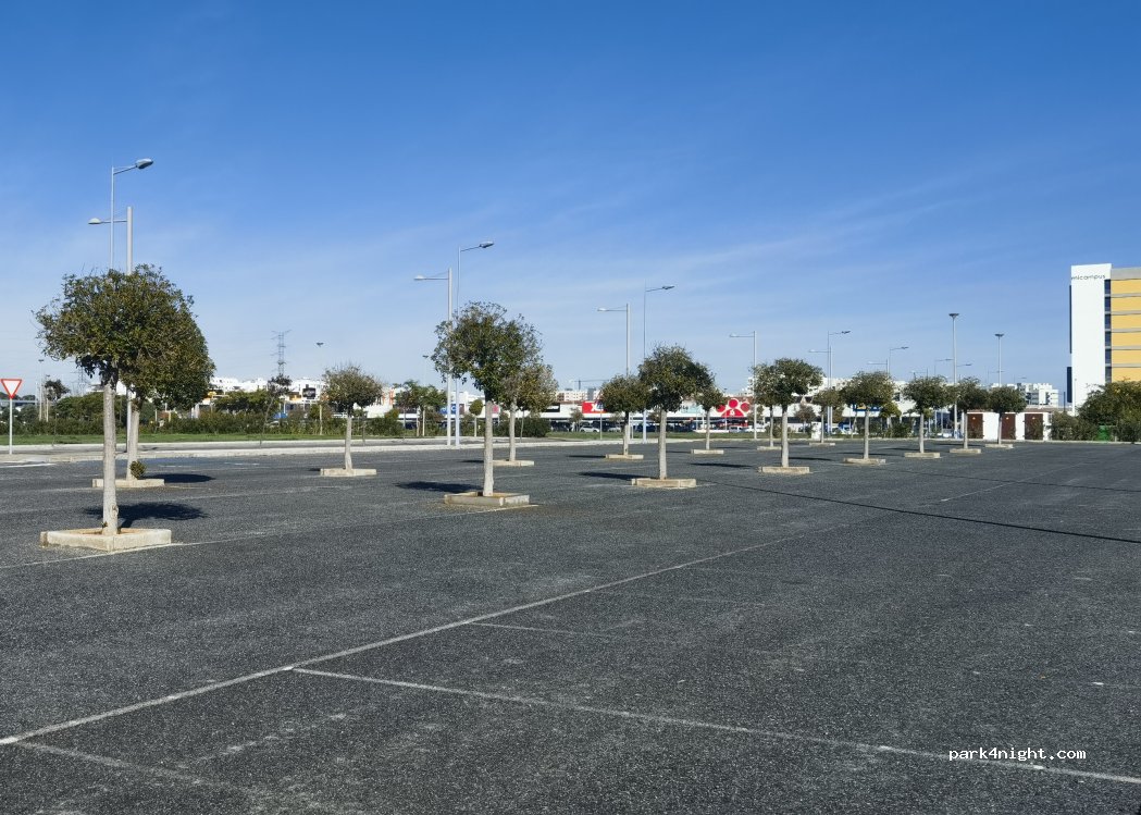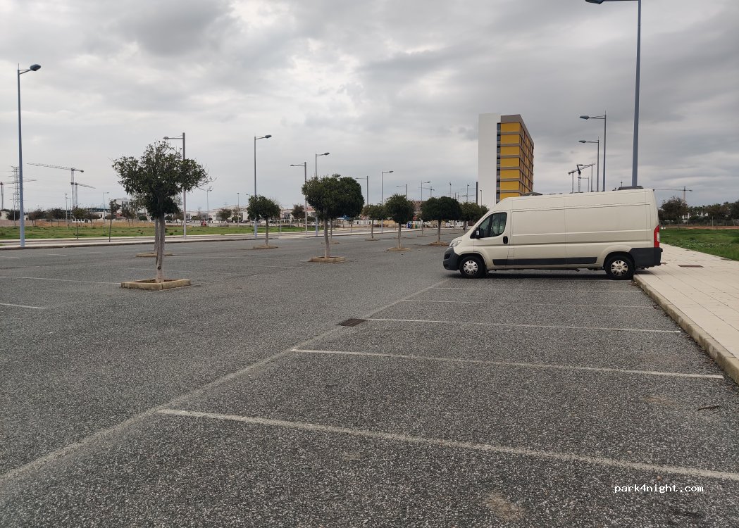 Stayed here for two nights. A residential area with development around, but very spacious. Good for all sizes of motorhome/van. Easy access to a level parking area under lights. Shops/supermarket within a hundred metres. Busy roads two sides, but quieten down around 10pm and through the night it was peaceful. We parked at Olivar da Quintos metro station to visit Seville, free parking and easy.