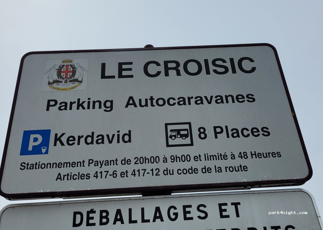 Gratuit en journée, idéalement placé pour visiter la vieille ville du Croisic, au bout du port, à proximité quasi immédiate à pied. Ne nous convient pas pour la nuit au vu du prix et de l'environnement, c'est un parking bétonné à l'arrière du hangar de la coopérative maritime.