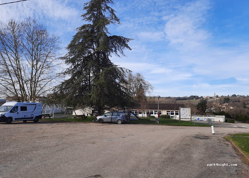 Parking d'une école donc très calme le week-end. Il y a des tables de pique-nique et une poubelle. Nous nous sommes juste arrêtés pour le repas du midi.