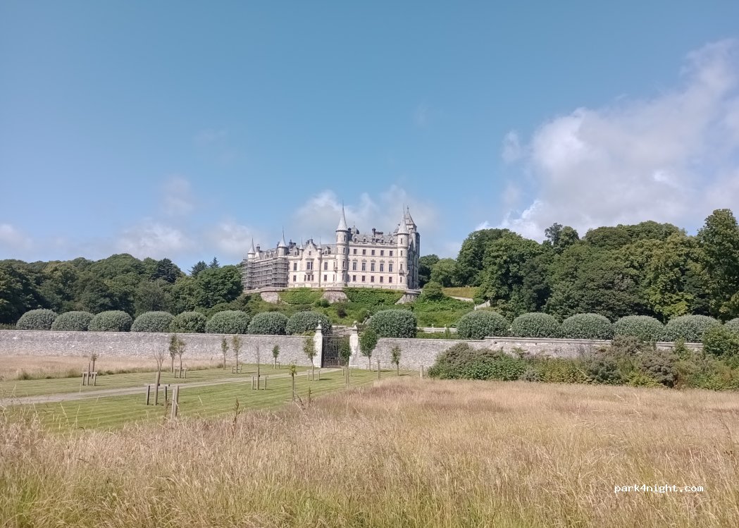 Parkplatz zur Besichtigung des Broch Cairn auf der gegenüberliegenden Straßenseite (3 min. Fussweg). Zwischen Bahnlinie (kein Nachtverkehr) und A9 (Verkehr erträglich) gelegen, leider nicht sehr sauber. Gut für eine Nacht. Ausreichend Platz für 10 WoMo, keine Verbotsschilder, Mülltonnen vorhanden. Zum Frühstücken sind wir dann doch zum Castle Dunrobin...