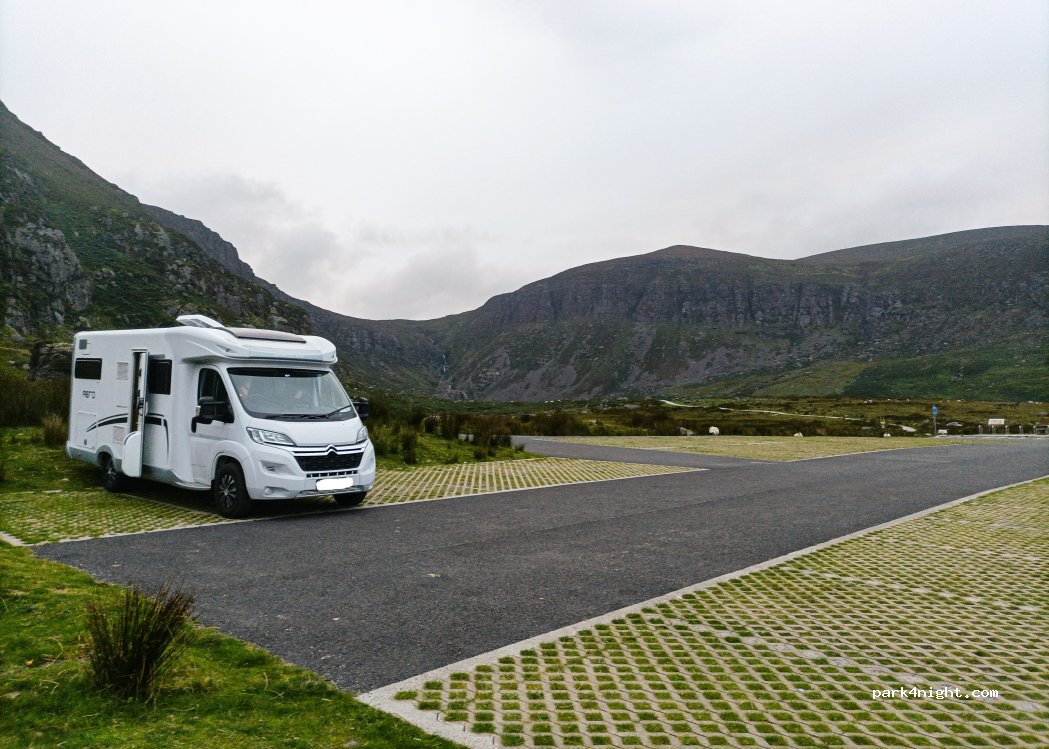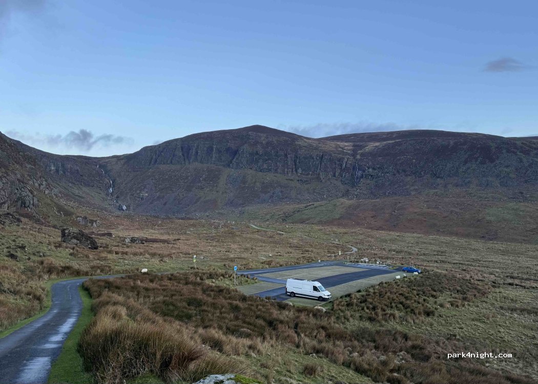 We arrived here very late in the evening in the pitch black… what a wonderful surprise in the morning to be parked up facing the waterfall and with a view over Waterford. A great walking spot. This is a lovely spacious park up with no facilities and lots of sheep. Very easy to fit a high roof XLWB van. Would recommend staying here.