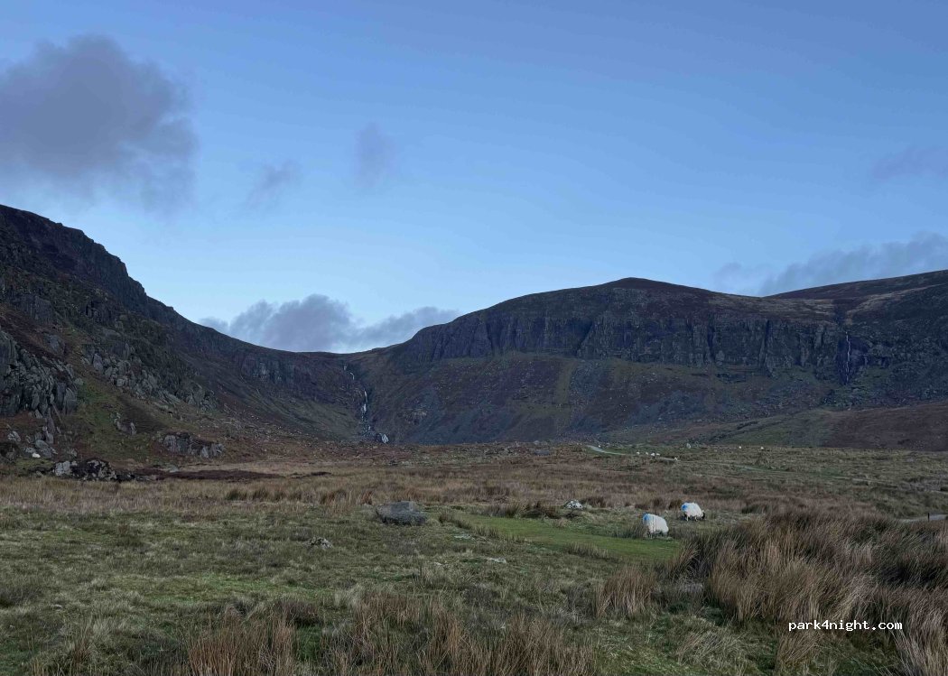 Quiet night here with two other vans. Basic car park with no facilities set in a gorgeous valley with views of the waterfall (well worth the short walk) and views looking back to the sea. There is a slight slope but it works fine in some areas. Car park didn't start getting busy until 10am ish on a weekday - until then the sheep will keep you company!