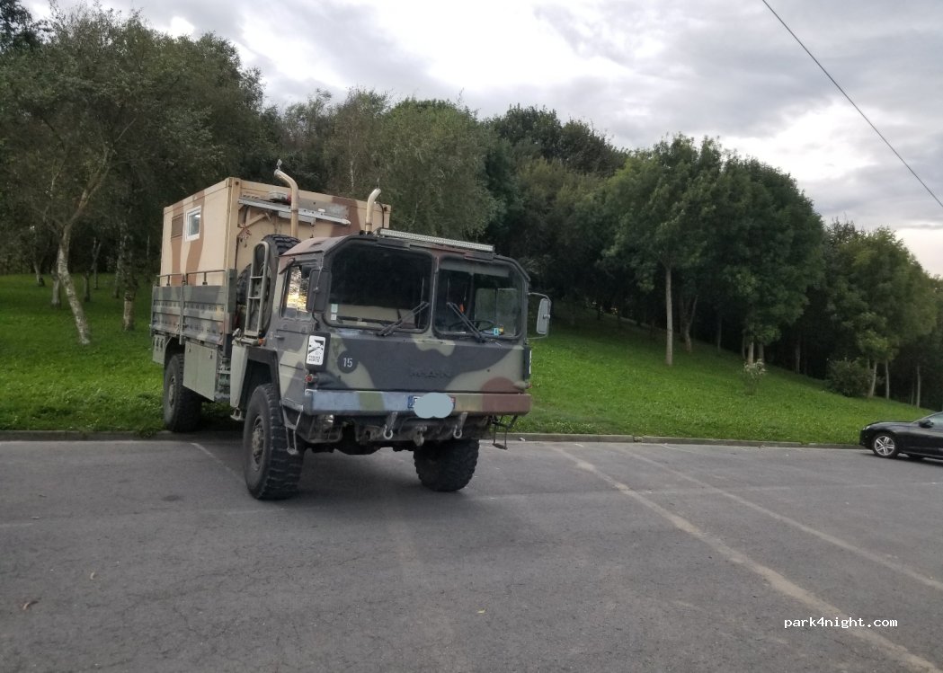 Place de parking adapter à tout véhicule Pas d'eau pas d'électricité mais la salle des fêtes au-dessus nous a accueilli pour 2 personnes à bras ouverts et le repas était excellent Bien pour une halte de nuit ou promenade dans les bois une journée