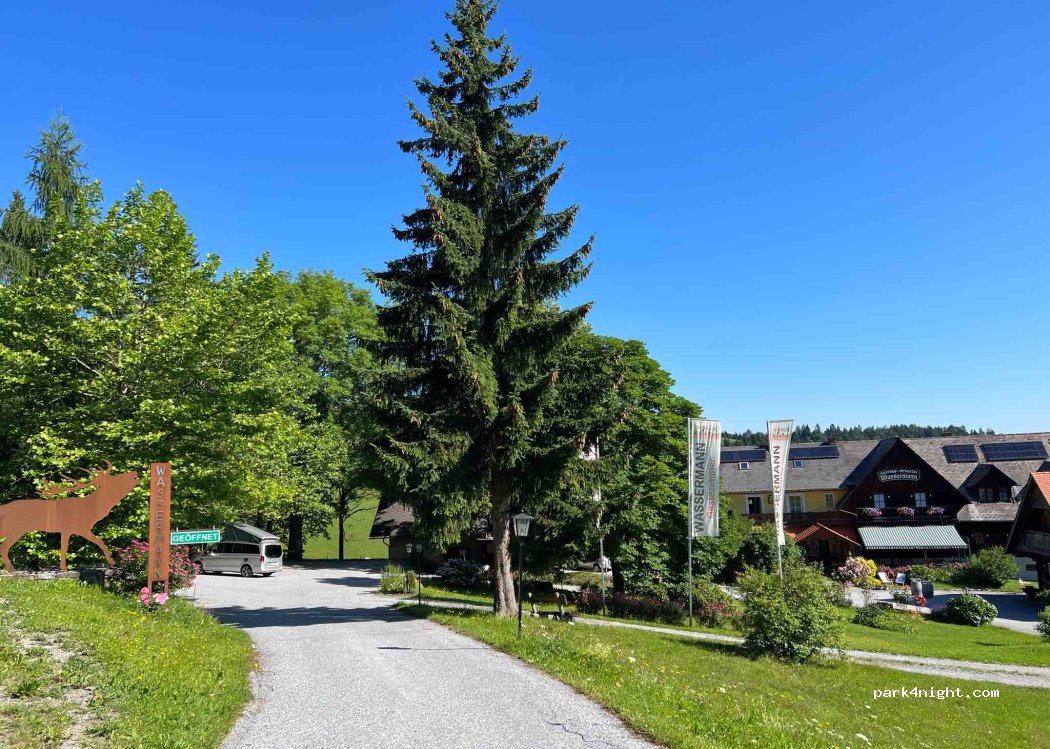 Wir standen kostenlos eine Nacht auf dem Parkplatz. Der Parkplatz ist etwas abschüssig gelegen, beleuchtet, liegt an einer kleinen Str. und direkt an einem Wildgatter, sodass wir mit dem Röhren des Hirsches aufgewacht sind. Die Lage ist wunderschön. Zum Abend haben wir im Gasthaus gegessen. Das ist wirklich sehr zu empfehlen, wenn auch nicht günstig.