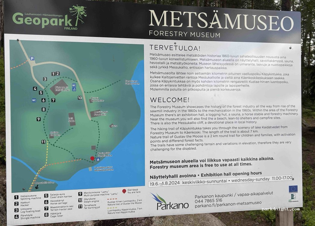 Plenty of space for spend a night. You can hear noise of cars and train. A few hundred meters walk to lake. Near by forest museum. Better toilet was closed at night.