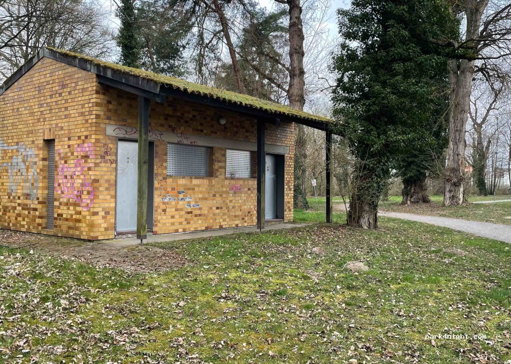 De parkeerplaats bevindt zich in een doodlopende straat bij het meer Eggenstein-Leopoldshafen, maar er zijn toiletten in de buurt, maar die zijn niet altijd open.
