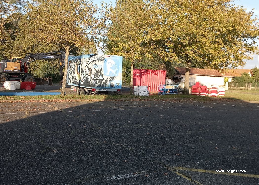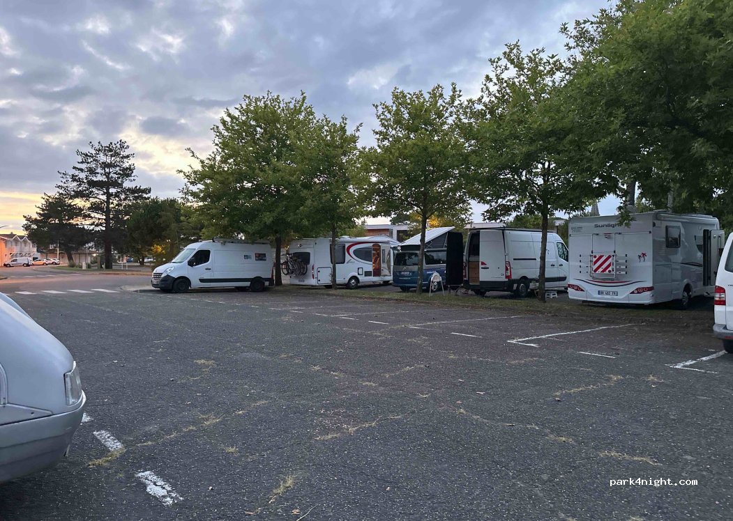Merci à la municipalité de proposer ce parking gratuit pour une nuit. Les places sont légèrement en pente donc prévoir des rehausses. Garage en marche arrière de rigueur pour les véhicules de plus de 6 m sinon vous depasserez sur l'allée du parking. Cette nuit nous étions 8 véhicules pour une capacité de 15. Les derniers sont arrivés vers 23h30. Nuit calme. Idéal pour une étape. Pas de services.