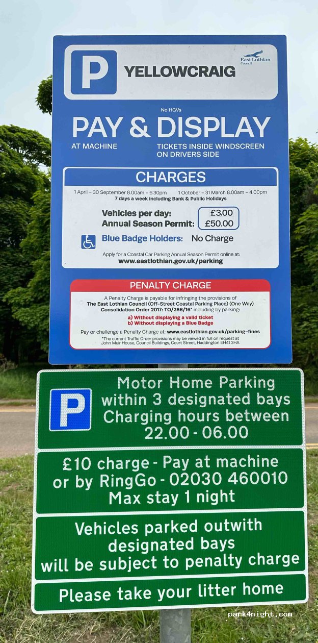 Parking now allowed 10pm -8am for motorhomes only in bays provided (there are 3). £10 for overnight stay . Pay at machine or via Ringo. Well done East Lothian Council!