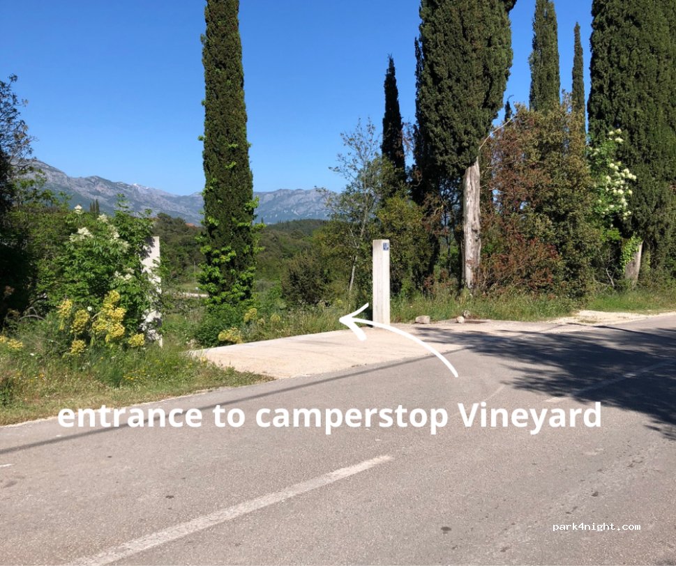 Camperstop Vineyard is located in the Konavle region, south of Dubrovnik, in the village of Komaji. Park your motorhome/campervan/motorhome to spend the night in a rural setting near the vineyard, surrounded by Mediterranean vegetation. Wine from our vineyard and Olive oil are available for purchase. Setting: rural, rustic. Motorhomes/campervans only. No tents, No Camper lorries. Number of pitches: max. 4 motorhomes. Dogs allowed / dogs must be kept on a leash and dog waste must be cleaned up. We speak English, Dutch, French, and Croatian. A bus stop to Dubrovnik is nearby. Pasjača Beach is 3.5 km from Camperstop Vineyard.