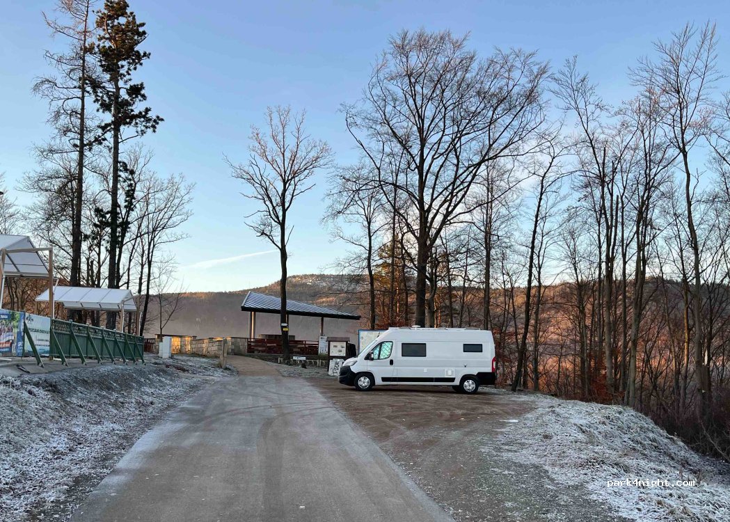 If you have trouble with the nav, go to 50.5066620, 16.3764598 and just drive 'till the end of the road - you'll arrive exactly at the viewpoint.