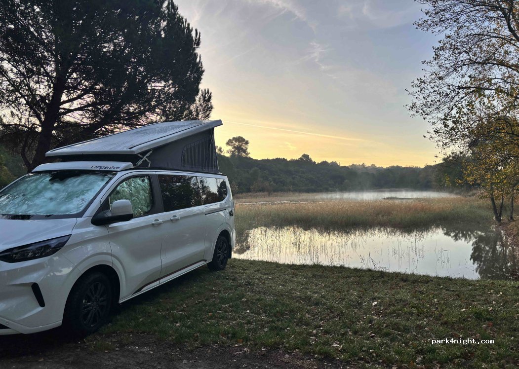 Une nuit très calme dans un lieu isolé. Le lac était vide (très peu profond de toute façon). C'est plat, mais notre fourgon a raclé le sol sur le dos d'âne situé sur le chemin juste au nord. Il convient donc d'arriver par le chemin sud. En soirée, quelques voitures qui empruntent le chemin. Le matin, quelques promeneurs et joggers. Il y a beaucoup de place, et merci à ceux qui l'entretiennent