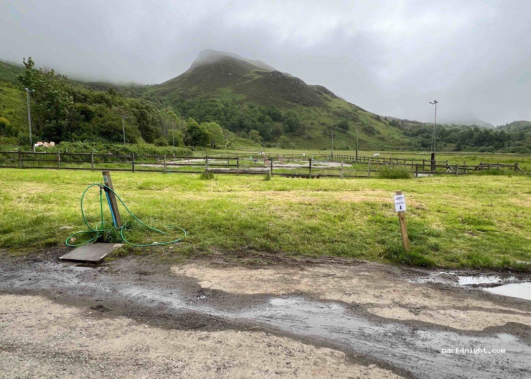 Nice overnight spot before or after Skye. Black waste disposal and water tap. No separate grey waste disposal. Good night's sleep and good value at £10 per night.