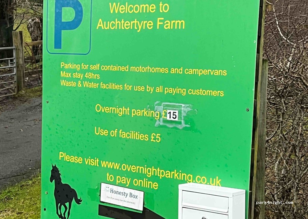 5 étoiles car il est difficile de trouver des services en Écosse pour les camping cars. Parking agréable dans une ferme, toilettes un peu sales, eau potable avec tuyau et vidange toilettes. Pas de vidanges eaux grises . Table de Picnic. Boite d'honnêteté pour participer aux frais.