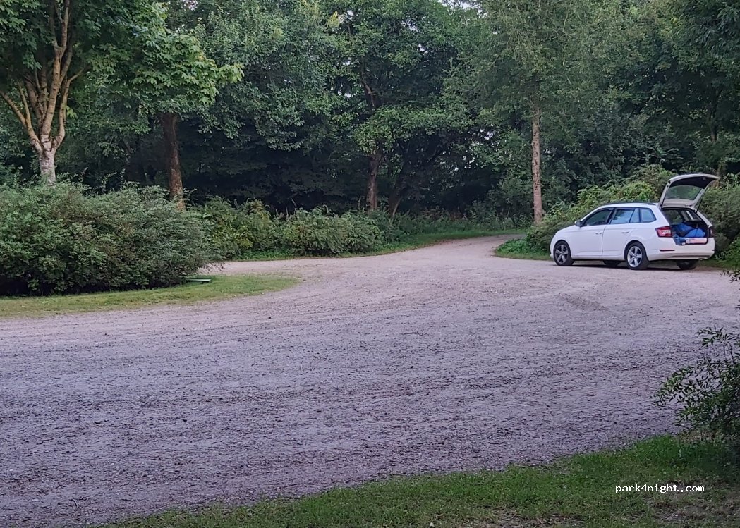 Der Parkplatz ist über einen Schotterweg zu erreichen. Der Parkplatz liegt ruhig und von Bäumen umgeben. Es gibt keine Schilder, die ein Nachtparkverbot anzeigen.