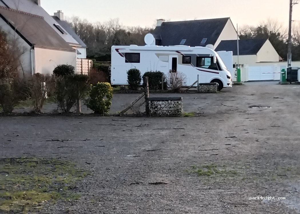 Aire calme proche centre ville avec restaurants un grand marché l’été,plages et belles balades à faire en vélo la pointe pen bron magnifique a ne pas manquer .emplacements permettant de déballer table et chaise (tout le monde le fait).