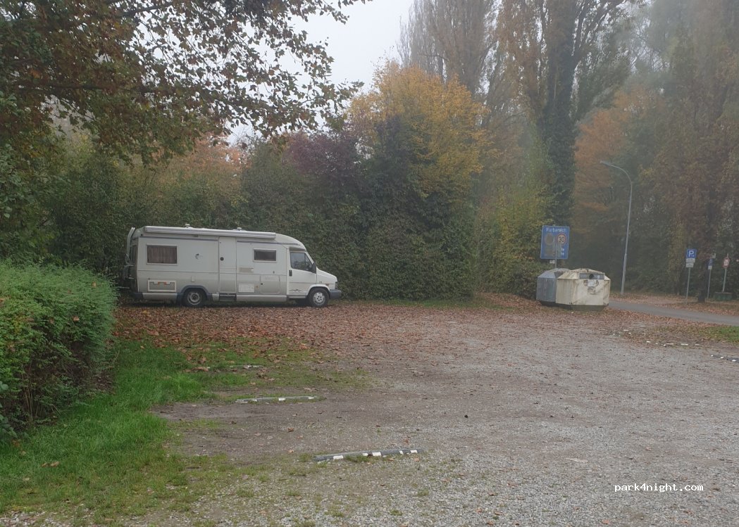 Fairly spacious, pebble parking surrounded by trees next to a street. Through the bushes one can see Bodensee and a big park w public bathroom is adjacent. On Sunday morning it got busy very early w people visiting the lake & park and the lot filled up quickly leaving no space for dog to roam. Place was swarming with mosquitos! Trash cans and glass containers on premises. Okay for a night.