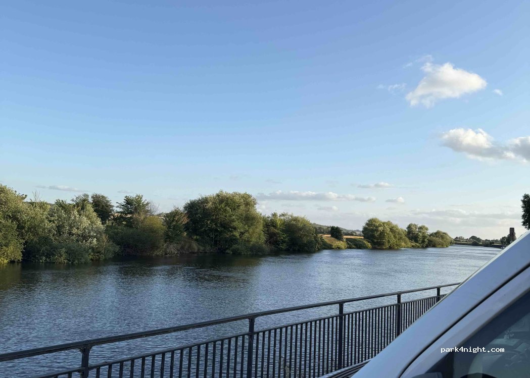 Beautiful view of the river and occasional passing boats. Stayed on a Saturday night,the road was very quiet,a couple of other vans here for the night too. Felt very safe,a few dog walkers and runners passing by in the morning. Shops a short drive away. Lovely spot :)