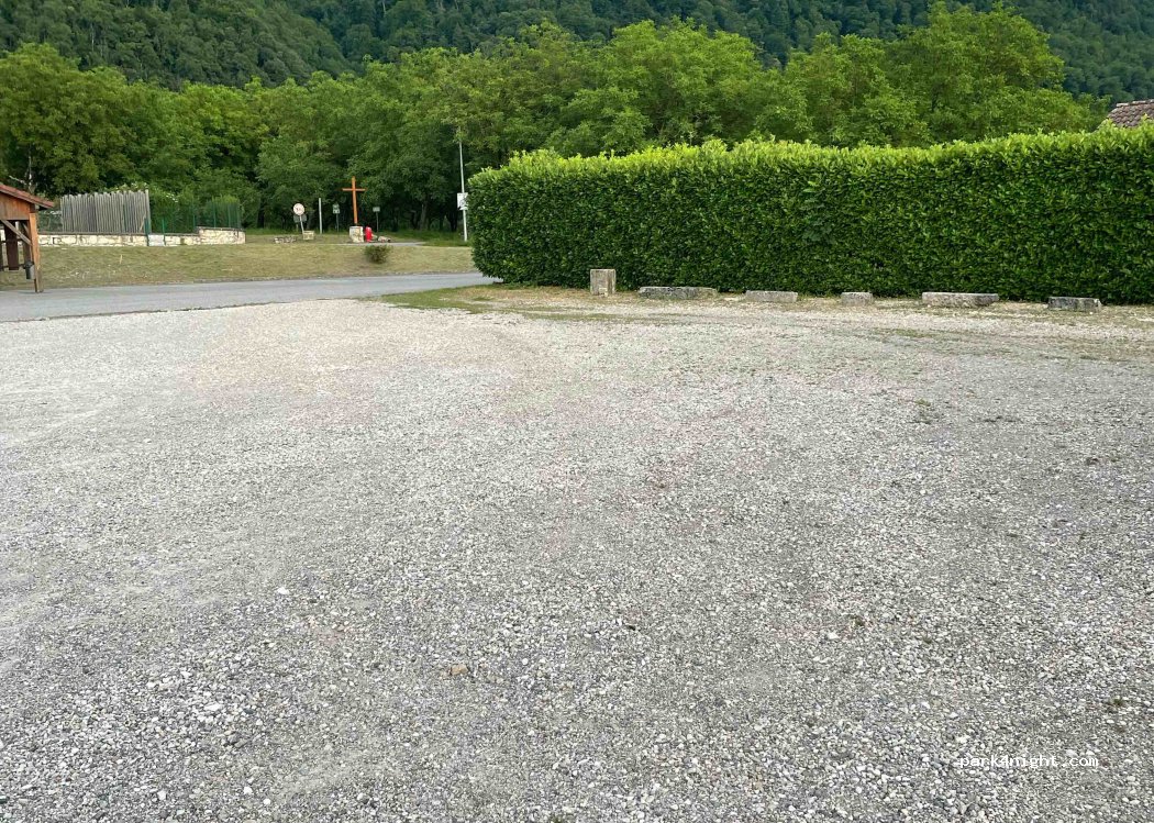PK en stabilisé (empierré) au calme devant la mairie ; pour le déjeuner ou pour une nuit. Prévoir cales…Un peu à l’écart de la route. L’accès est plus facile en arrivant de Romans direction Grenoble ; sinon vous traverserez le village…Poubelles.