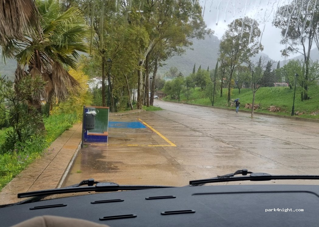 Malheureusement la commune ne peut pas grand chose sur le temps et c'était général sur l'Andalousie. Parking calme, eau, vidange, près du joli village. tous commerces accessibles à pieds. Merci à la commune de Cortes de la Frontera. De jolies randonnées aux alentours pour les amateurs de belle nature.