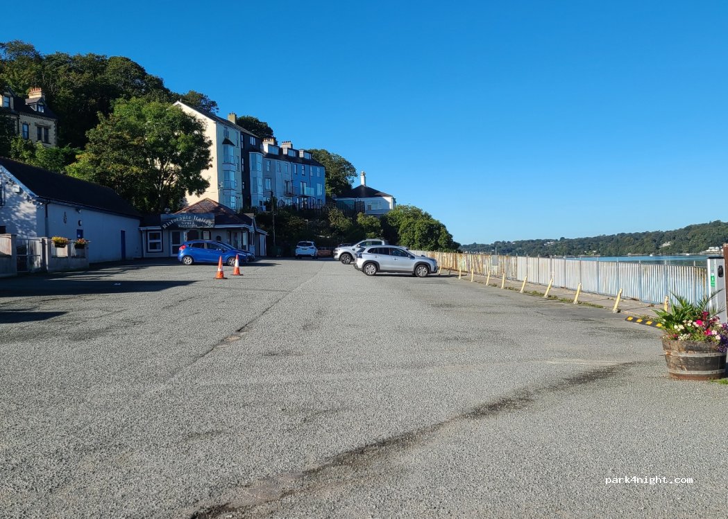 Parking area next to the pier, pay at the pier kiosk. Numerous spaces and great views of the Menai.