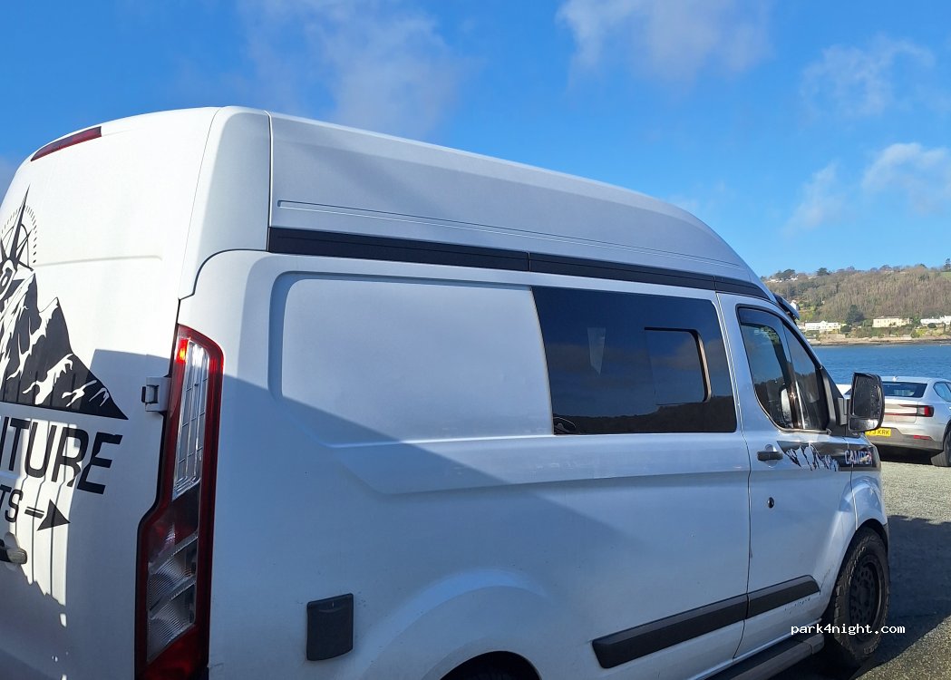 Parked here for the day and night for £20 I think thats a grate price. Nice and easy to go and explore Bangor on foot the back to the pier knowing you have a park for the night?. The carpark is on a slight slope towards the water but in my opinion it’s not 2 bad you could always bring a set of levelling ramps