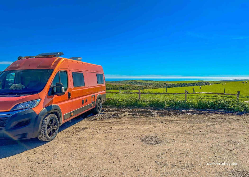 Amazing spot! Patchy signal on 3…. Three other vans with us one inconsiderate parking so plz don’t park long ways! If your too long go elsewhere…. Dog walkers in the morning - free but rumours of this place going to ANPR are about! Let’s look after it the best we can. Very windy but we liked that - toilets at Beachy head national trust and the Chaplin office car parks