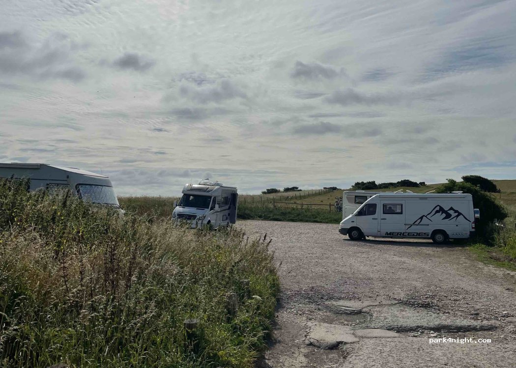 Flat stony car park. Space for several cars/vans. Quiet at night and amazing views across fields to the sea. I stayed a few nights and a full day just relaxing. No bother at all. Great walking along the South Downs Way. Other walkers coming and going during the day but all friendly.