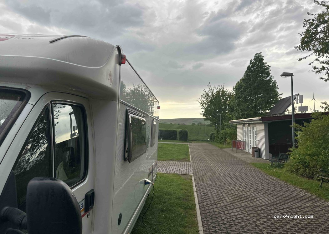 Sehr netter Empfang durch Fr. Born. Die zeigt jedem den richtigen Platz. Schön ruhig, umzäunt von einer hohen Hecke, neben dem Hof ausserhalb gelegen. Sanitär sehr gepflegt. Mann und Frau hat je 1 Dusche, 1 WC, und 1 sep. Waschbecken. Daneben Spülküche und WC-Entleerung. Und natürlich die offene Weinprobe, sehr zu empfehlen.