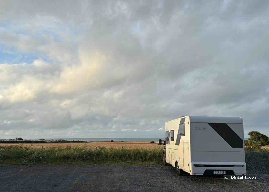 Auf dem Parkplatz des DDAY MUSÉE. Auf einem Schild steht: „Zugelassen für Wohnmobile, Museumskunden. Und die Besitzer sind wirklich nett. In der Kirche gibt es ein paar Dutzend Meter tiefer Wasser. Blick auf das Meer. sehr ruhig. und vor allem sehr selten in der Gegend. Riesig , ebener Parkplatz, abgesehen von jeglichem Lärm