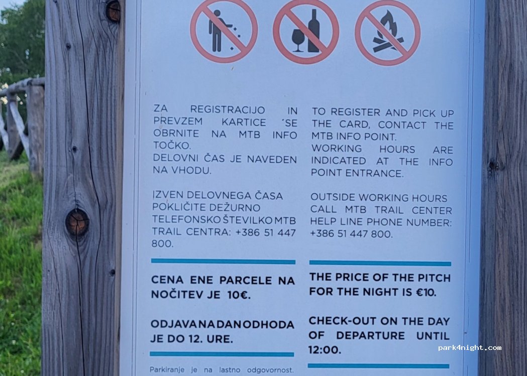 Der Platz ist schön angelegt. Die Nähe zum Trailpark ist super. Dusche ist warm und hat Druck. Toiletten sind vorhanden und werden gereinigt. Keine Möglichkeit Frischwasser zu tanken.Das Personal im Trailcenter ist stets freundlich.Nachteil: Slowenen scheinen den Platz hin und wieder zu nutzen um Wagenburgen zu errichten und ohne Rücksicht zu feiern. Dann wird es auch trotz Abgeschiedenheit laut.