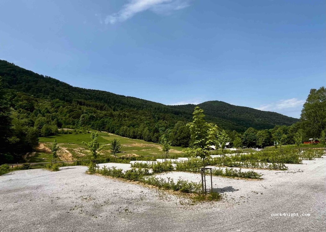 Perfect - big and flat places, toilets/shower, great MTB area with shuttle service during nice weekends. Note that first photo is wrong - that area is for cars only. Motorhome area is with designated pitches (second photo). Tents and caravans also permited.