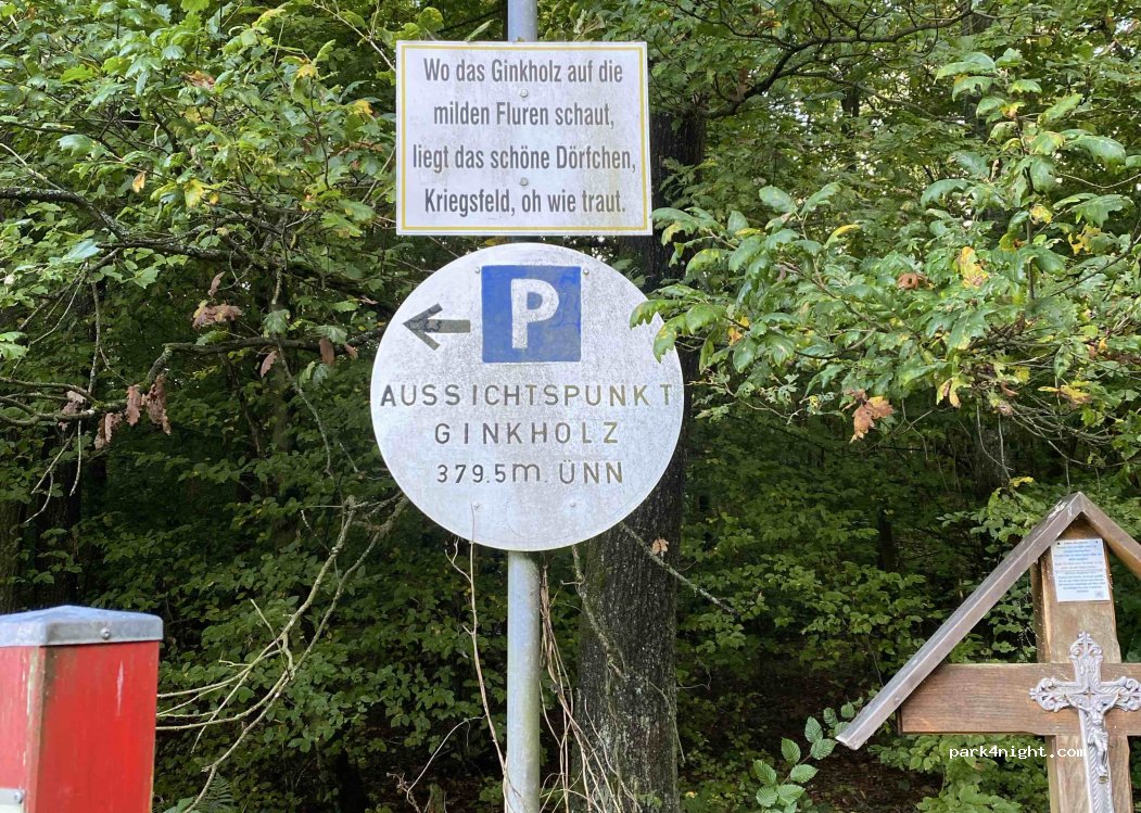 Forest car park Ginkholz - very quiet, small forest car park, surrounded by extensive forest and fields. Very nice starting point for hikes. The rubbish should be taken with you as usual, the small rubbish bin is not suitable for everyday rubbish. Overnight stays are tolerated.