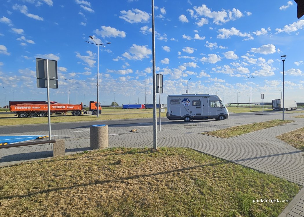 Parking nouvellement construit au bord de l'autoroute avec station Lotos et Burger King. Le stationnement est gratuit. Service payant pour l'eau et l'électricité.