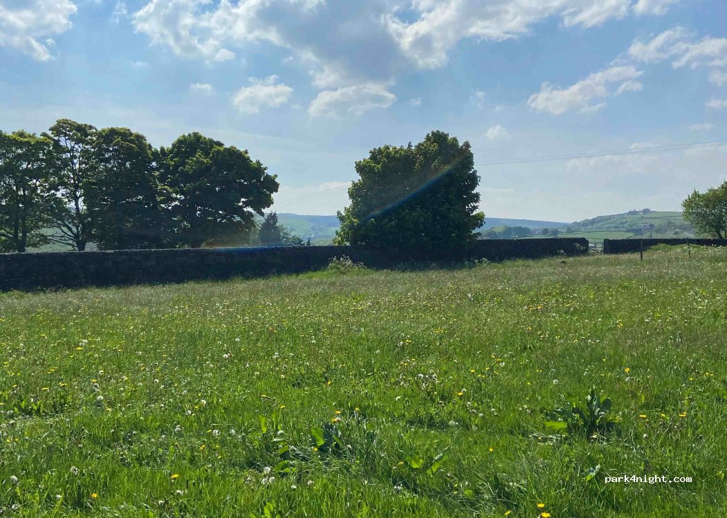 Flat field, open views. Enter through gate, park up. Payment will be collected am/pm. All visitors must have onboard facilities. Walking and mountain biking Village of Heptonstall 200m with 2 pubs, gift shop, PO and cafe. Hebden Bridge 1.5km