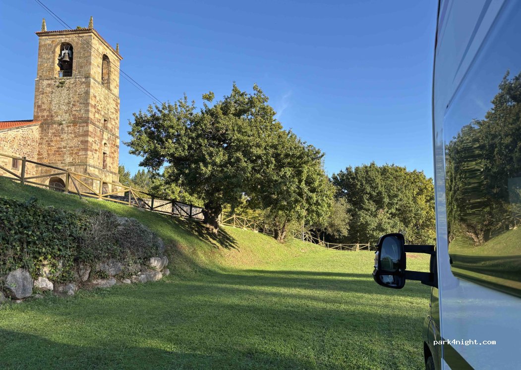 Ampio spazio erboso in piano, sotto una chiesa di paese. Un gruppo di ragazzi e ragazze giovani si sono ritrovati lì e poi sono ripartiti senza dare fastidio. Abbiamo passato la notte con un altro van. Posto tranquillissimo. La sera è venuta una signora a fare una passeggiata con il cane e ci ha salutato cordialmente.