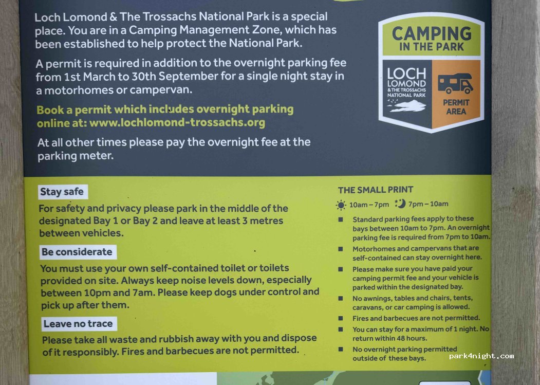 Parking de nuit possible et autorisé, de mars à septembre payant (3£) gèré par les "loch lomond Rangers" qui passent le soir pour vérifier que vous êtes au bon endroit (les places sont matérialisées par des micro panneaux ! Et il n'y en a que 4). L'emplacement est très agréable mais attention très fréquenté en journée les week-ends