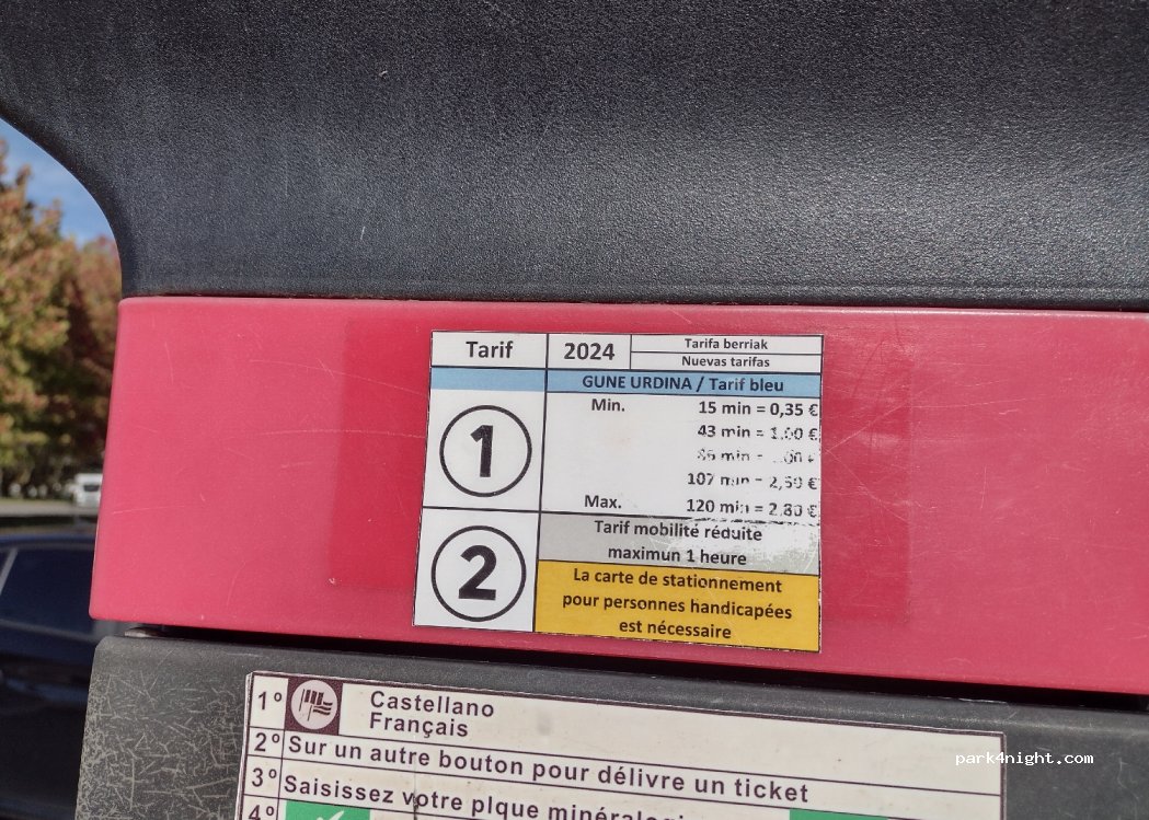 Buen sitio para pasar la noche. Cerca de locales comerciales, bares y restaurantes, aunque alejado del centro de Irún. Es un aparcamiento de pago. Se paga todos los días entre las 9.30 y las 19.30.
