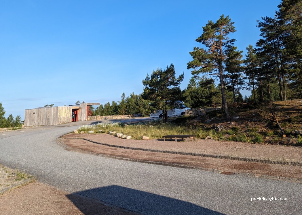 Un parking avec exposition historique sur l'évolution du quartier depuis l'âge du bronze. Point de vue sur la vallée en contrebas. Aucune interdiction de passer la nuit. Escale possible vers la Norvège/sud de la Suède. Toilettes publiques, mais pas de borne de service.