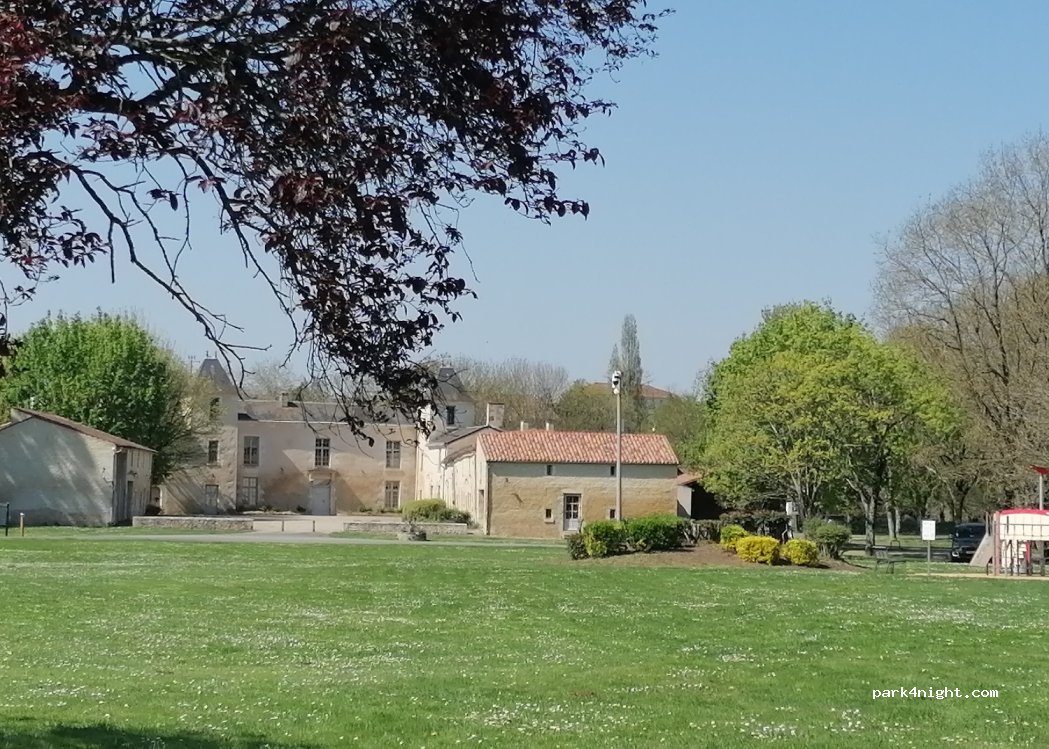 Reception and service area for motorhomes located in Nieul s / l'Autise, Small Town of Character and municipality of the Marais Poitevin Regional Natural Park (Green Venice) Free parking in the Vignaud park, shaded and calm. Close to shops, restaurants and tourist sites: Royal Abbey and Maison de la Meunerie. Heritage discovery tour departing from the park. Need long electric lead as 4 points only and parking spaces separately by large conker trees. Plug in then pay for electric at the service point not where you park