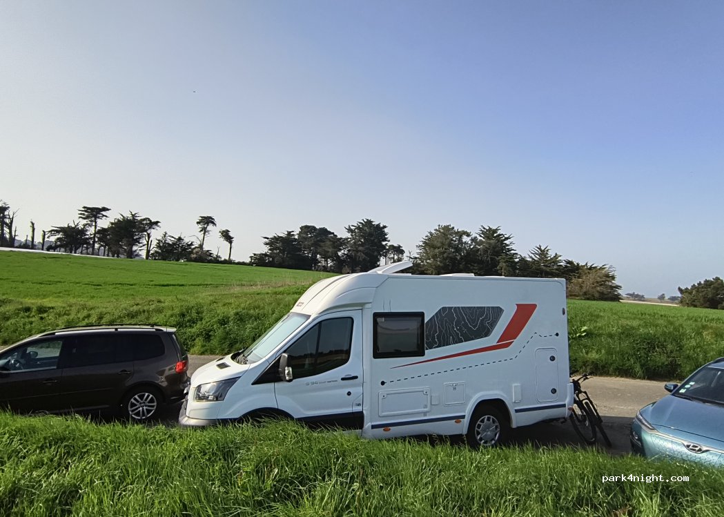 C’est une air de parking au bord d’une route avec stationnement en épi en pente. Bien pour se garer mais pas pour dormir