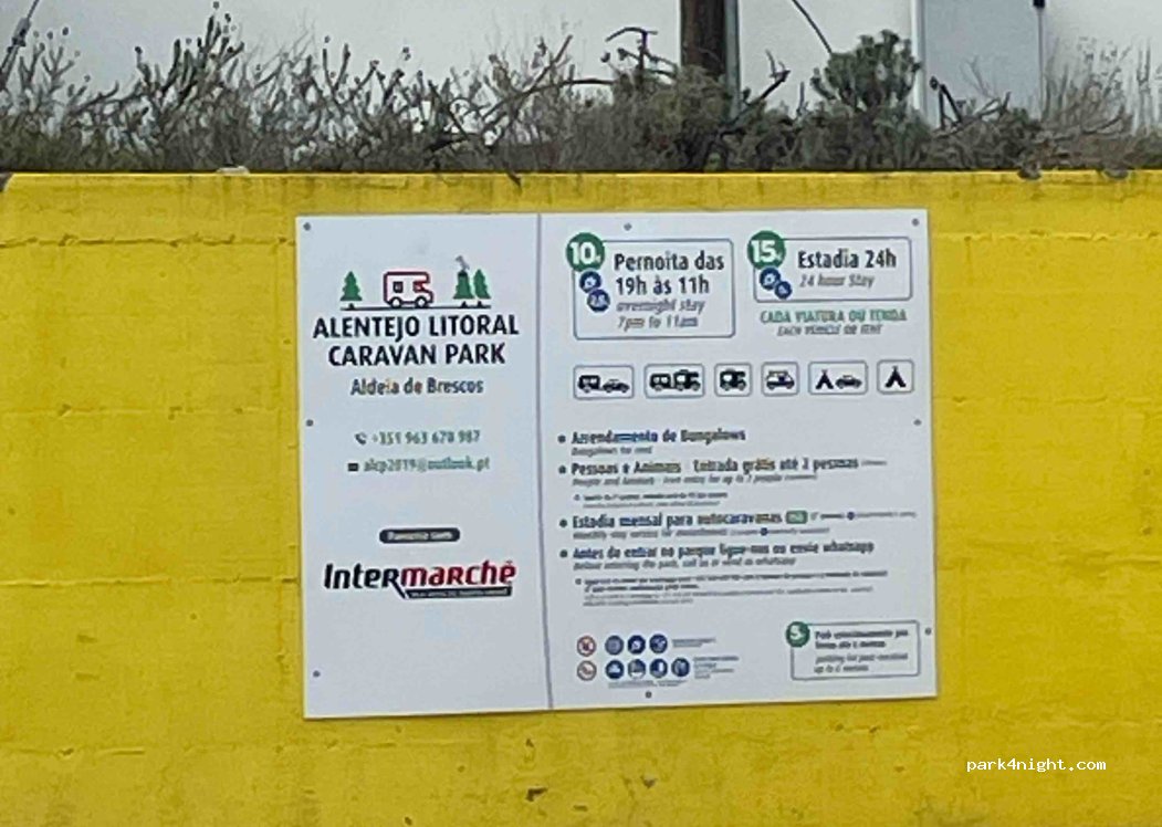 Não é cobrado os valores para pernoitar nem para estadias, como refere no cartaz. Apenas é cobrado para limpeza das águas. Se efetuar compras no Intermarché no valor de 20 euros, o serviço de limpeza de águas é grátis.