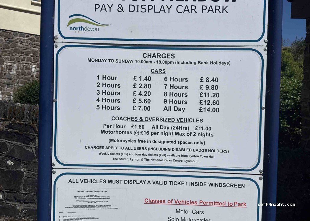 Moho parking now allowed, although not all signs updated. 3 bays allocated and neither app nor ticket machine updated yet. Should be £15 pn two nights max. I had to phone council as machine only takes £5 max, they said system is not updated yet. Rating lowered because chokes definitely needs because of the slope. Access is difficult from either direction town narrow or hill from Lynmouth steep