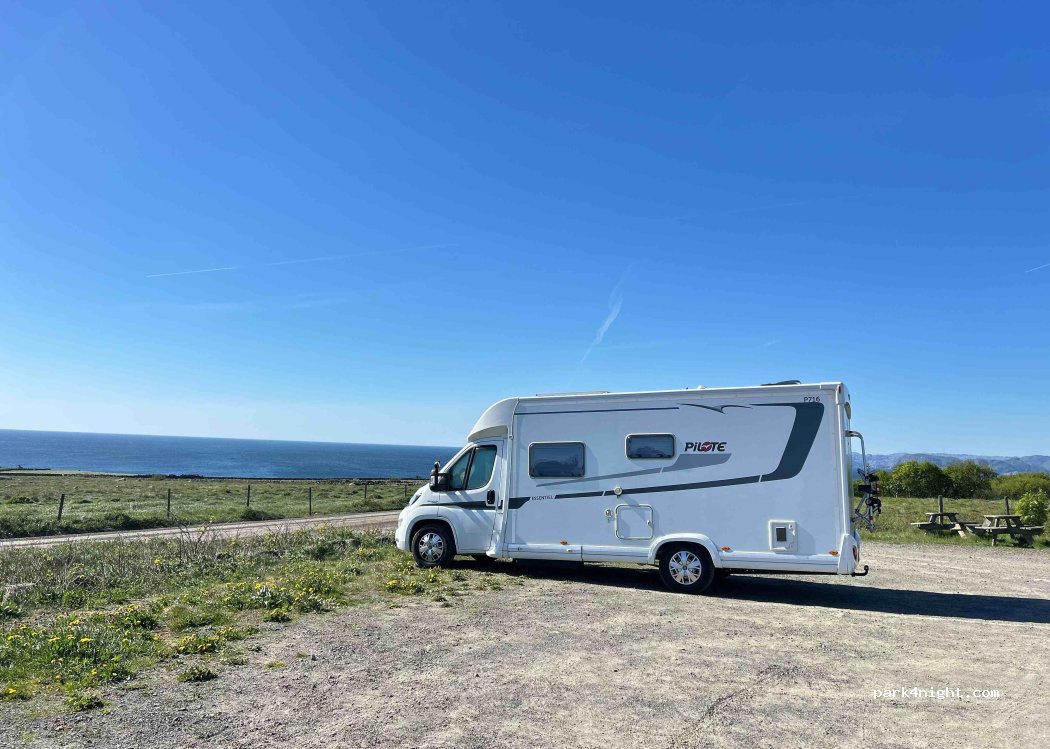 Toll gelegener Platz mit Meerblick. Eigentlich ein Parkplatz für eine naheliegende Sehenswürdigkeit aber es stört niemanden, wenn man über Nacht stehen bleibt. Zum Strand und dem nächsten Hafen mit Entsorgungsmöglichkeit sind es ca. 5km. Wir sind 3 Nächte geblieben. Nachts kaum Verkehr auf der kleinen Straße. Bitte den Platz in Ordnung halten, damit er lange ohne Verbotsschild bleibt.