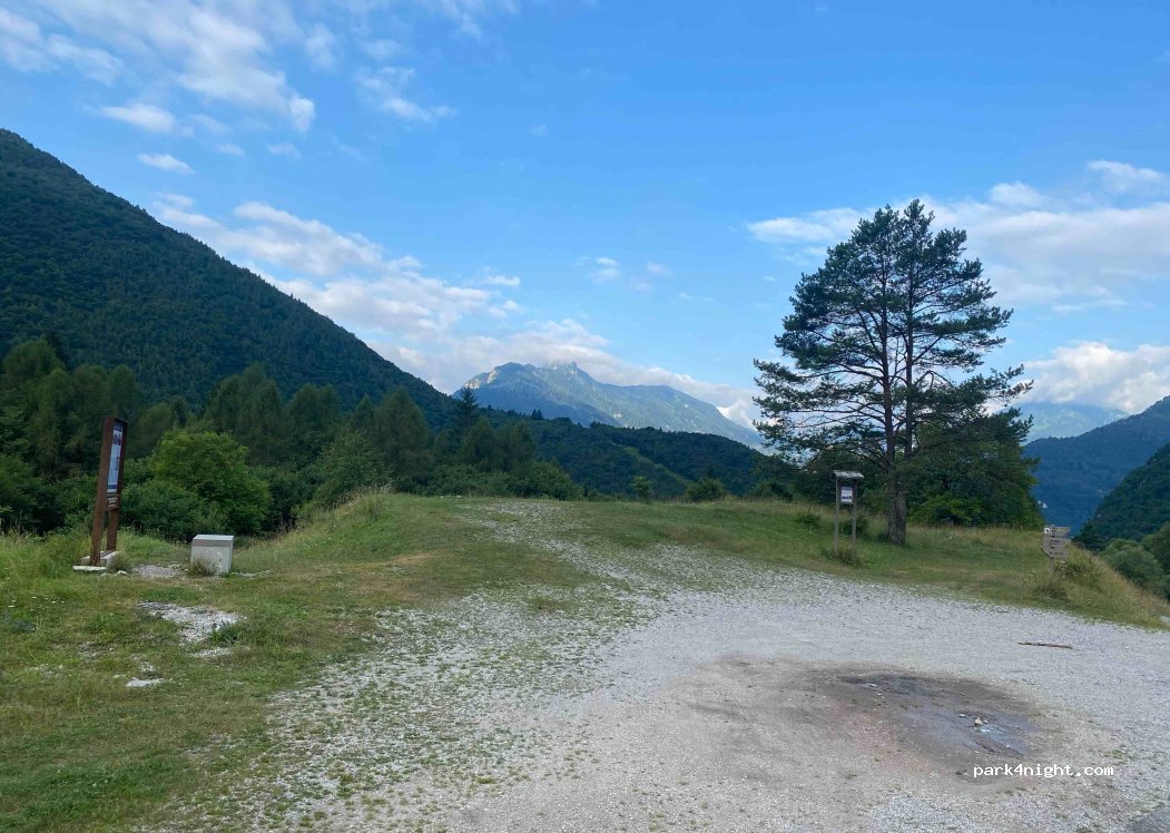 Area di sosta molto suggestiva ai piedi del monte Toc, a circa 1 km dalla diga. Ho dormito qui due notti senza problemi. Posto molto tranquillo nel mezzo di un prato circondato da alberi lungo una strada laterale. Circa 500 metri prima si trova un altro ampio parcheggio pianeggiante sullo sterrato.