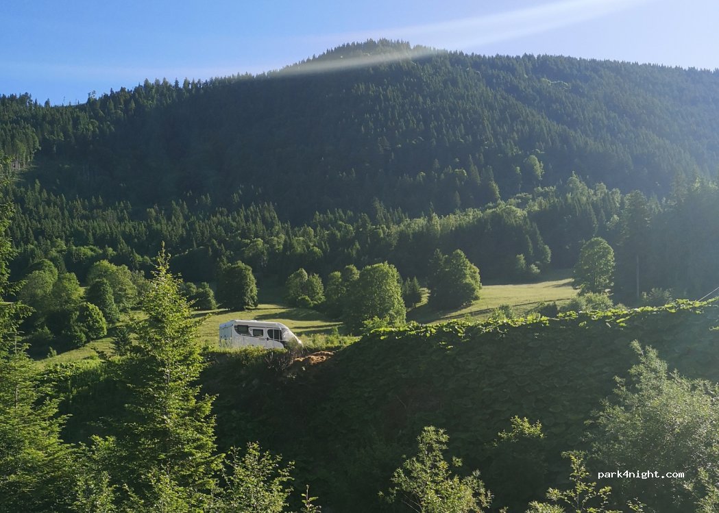 Very large parking area, meant for the ski season. It is covered with gravel, flat. No height limitations, no restrictions of any kind. We parked here in May and there were no more than 3 campers, 300 m away from each other. One can park just above the river. No traffic, perfect silence.