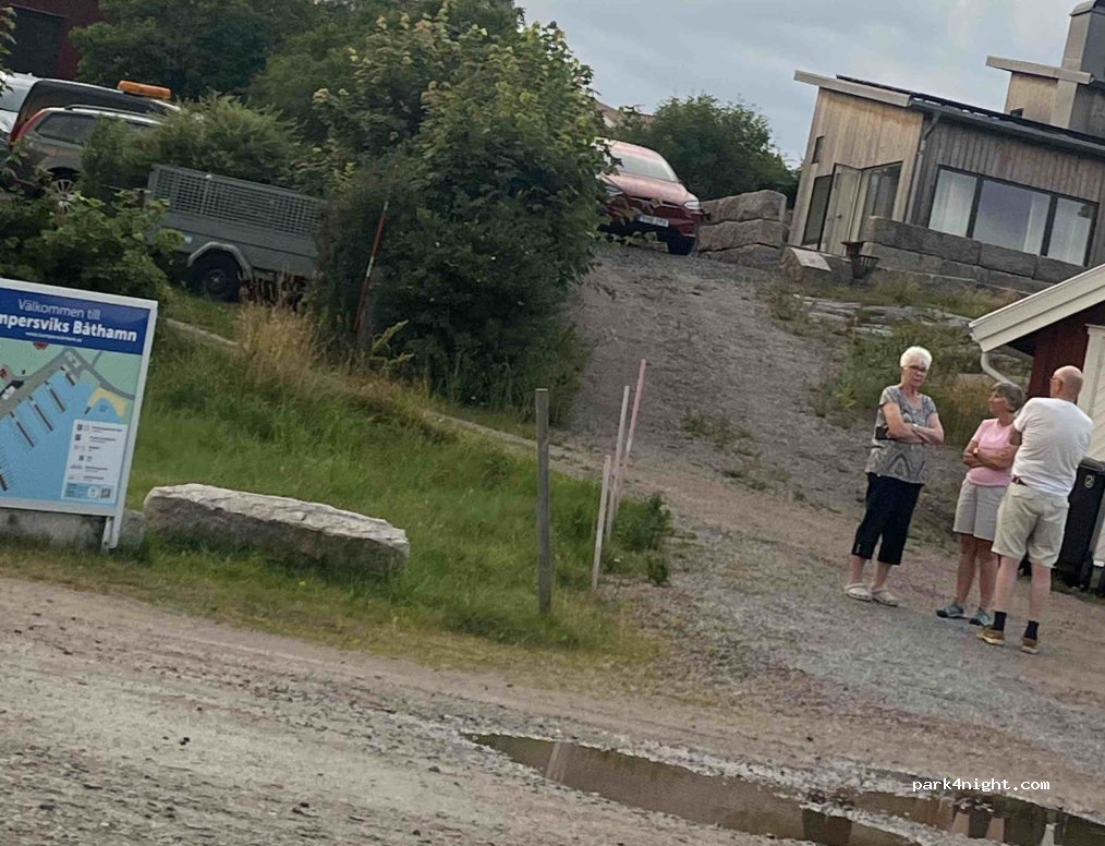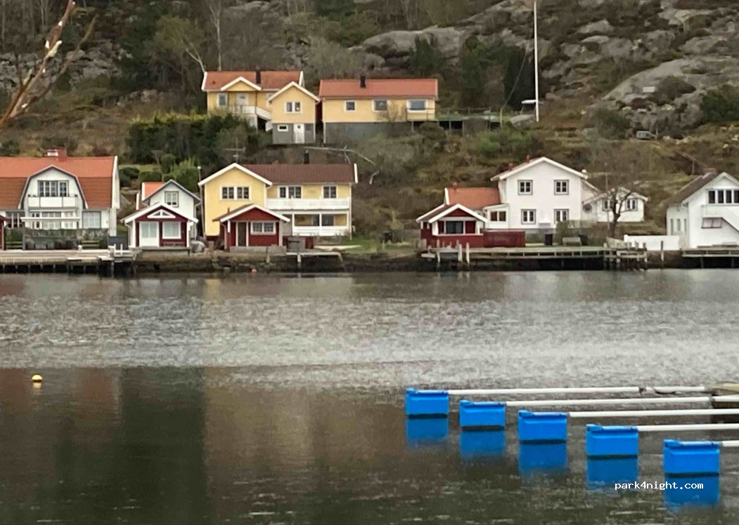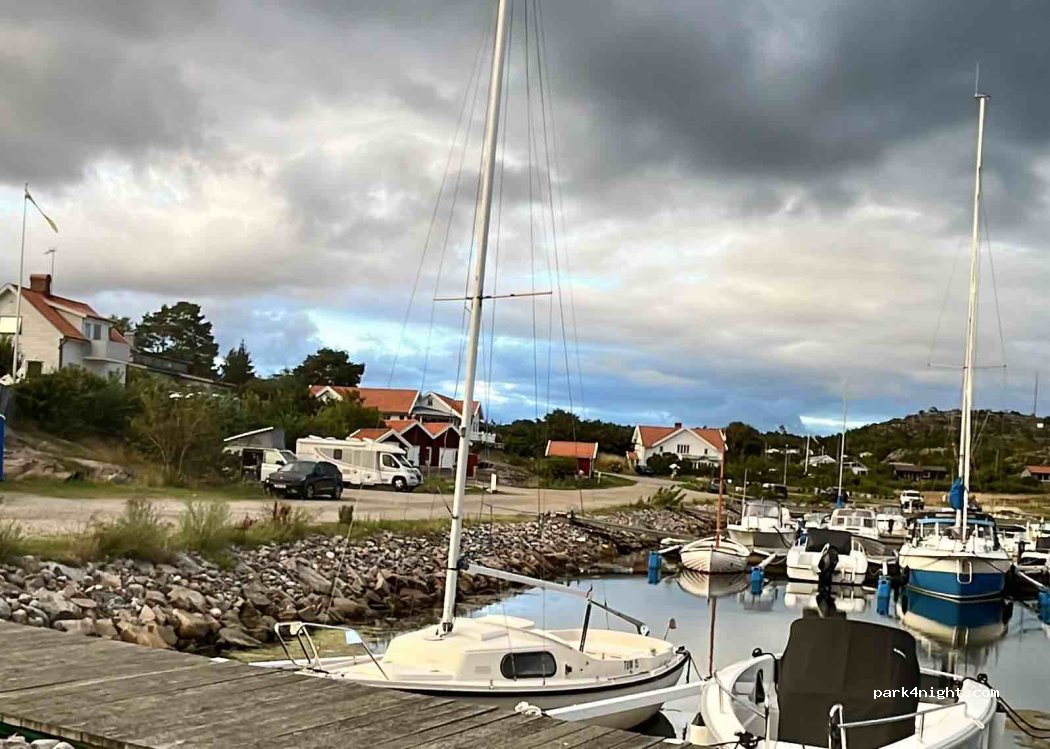 ein Schotterplatz in einer kleinen traumhaft schönen Bucht mit Jachthafen. Wir waren alleine dort. Drumherum überwiegend moderne Ferienhäuser, der kleine Ort wirkt leblos. Keinerlei Infrastruktur, was vollkommen un Ordnung wäre, müssten für die Übernachtung nicht 250 SEK. Das ist unverschämt teuer.