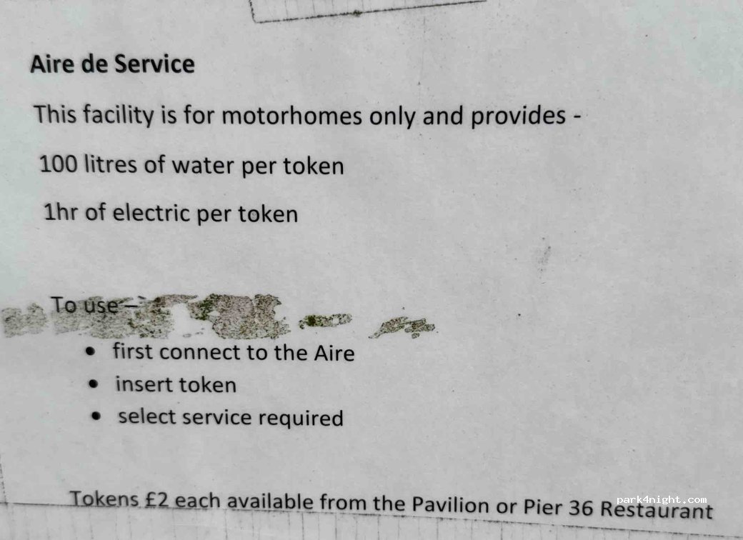 Lovely place and friendly people, you cannot park overnight but you can stay all day. There are tokens for the water etc and a sign to say where to pick up from or the office on site if open … think that’s only open in season. Disappointed we could not stay overnight as nice spot. Signs say no overnight stay