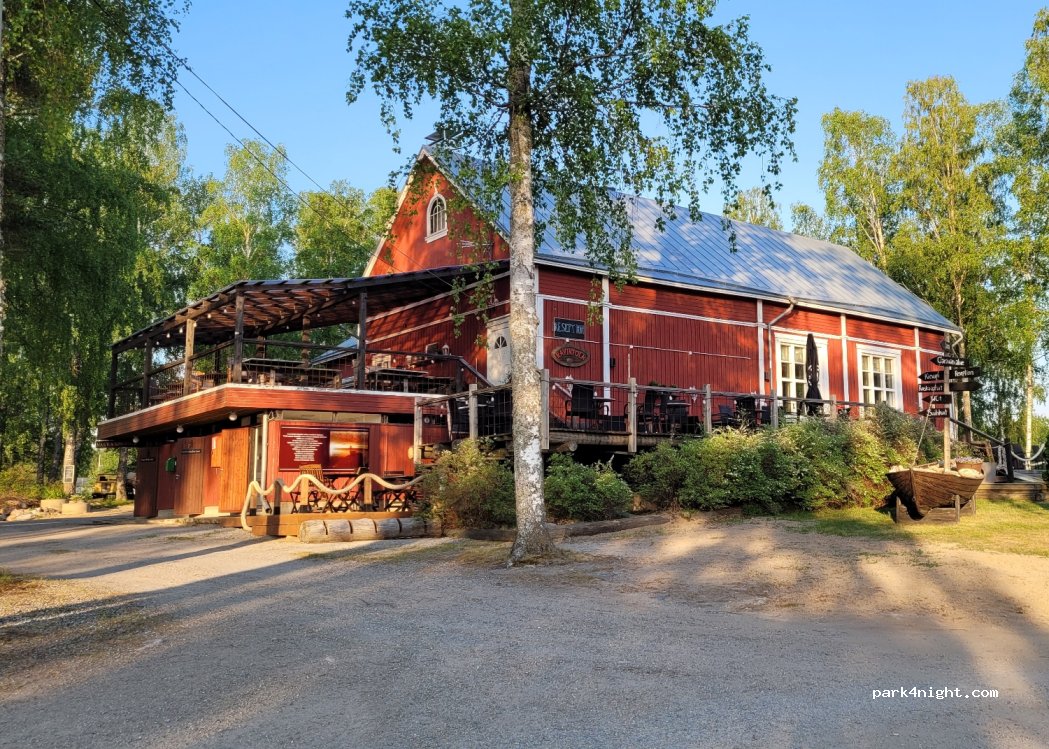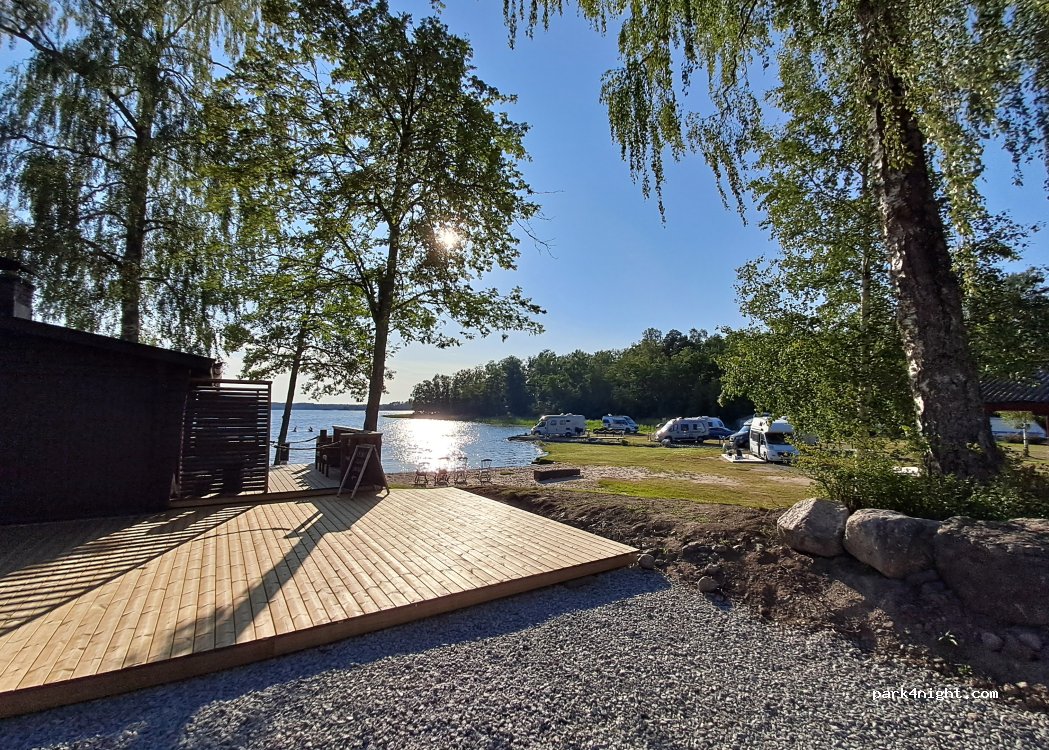 Small camping by the sea. The firewood sauna is very well built with the steam distributed evenly in the room. The sea is shallow but we enjoyed swimming especially after sauna. The restaurant has lunch and dinner menu every day with nice views of the sea from the terrace. In the weekends they have karaoke partys. The kids space is excellent with self-built wooden small houses, cars and swings. Some spaces have wooden docks, which is really nice. Overall very nice camping, we came here for two days and ended up staying four.