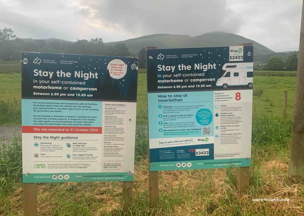 Dans le cadre de l'essai Forestry and Land Scotland Stay the Night 2022. Parking principalement réservé aux vététistes empruntant les sentiers d'Innerleithen (à pied ou par remontées mécaniques). Parking officiel Forestry and Land payant.