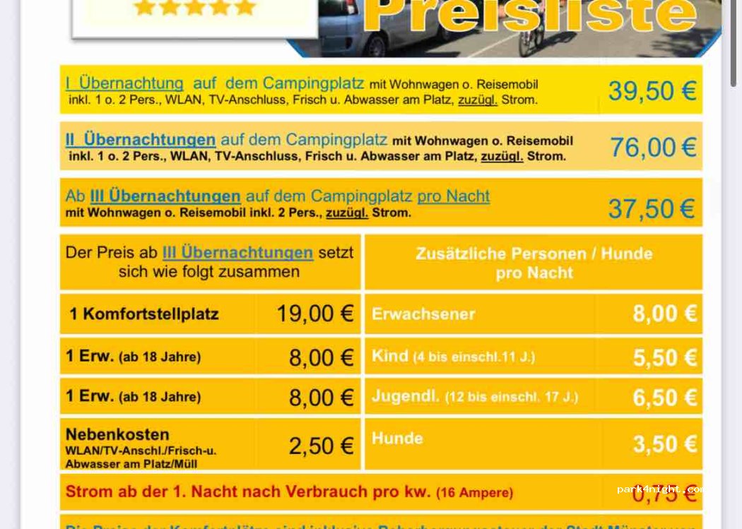 Platz hinter Schranke 21€ incl. Strom für Womo 2 Pers. Schöner Platz, gepflegte Stellflächen, saubere Sanitäranlagen, freundlicher Empfang. Sehr gute Busanbindung nach Münster direkt vor dem Platz. Ver-Entsorgung direkt vor dem Platz. Würde wieder herkommen.